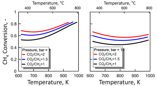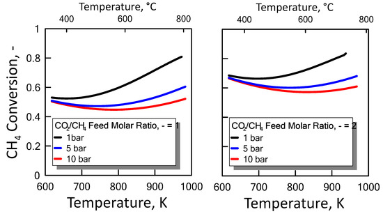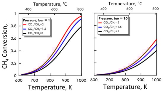CH4 equilibrium conversion at 1 bar (left side) and 10 bar (right side) as a function of temperature, varying CO2/CH4 feed molar ratio from 1 to 2.