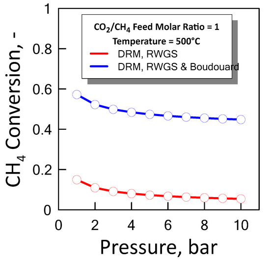 CH4 equilibrium conversion at CO2/CH4 feed molar ratio of 1 and temperature of 500 °C as a function of pressure.