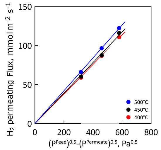 Figure 10 shows the hydrogen permeating flux as a function of the Sieverts′ permeation driving force at different values of temperature. As expected, hydrogen flux increases linearly with increasing driving force, indicating an ideal membrane behavior (i.e., permeation completely controlled by internal diffusion and hydrogen concentration in the metal lattice close to the infinite dilution).