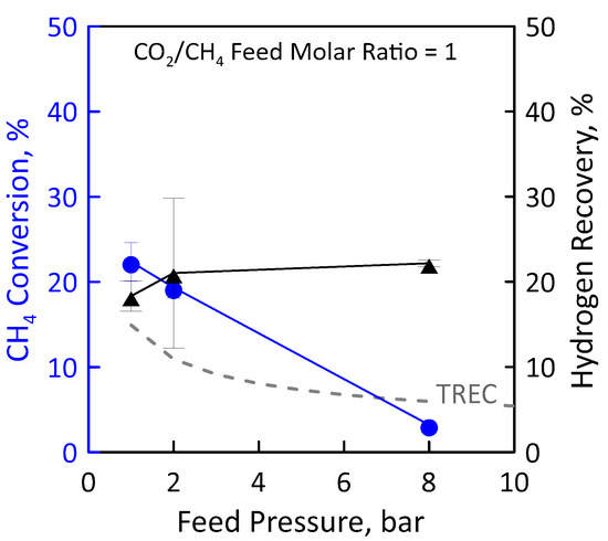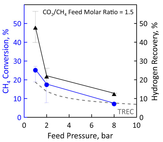 A higher methane conversion means a higher methane amount that reacts for producing hydrogen. For this reason, the hydrogen recovery follows the same trend as that of conversion (Figure 12, right axis). At a feed pressure of 1 bar and 0.02 bar of vacuum on the permeate, about 47% of hydrogen is recovered as a pure stream in the permeate. A higher feed pressure means a lower CH4 conversion, and, thus, less hydrogen produced and that can be recovered. However, it has to be pointed out that, even in the worse conditions (i.e., 8 bar), around 15% of hydrogen is recovered.