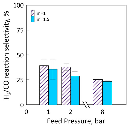 H2/CO reaction selectivity as a function of feed pressures at CO2/CH4 feed molar ratio = 1–1.5, permeate pressure = 0.02 bar.