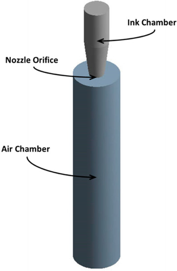 To properly test the hypothesis that RSM is a suitable tool for predicting the jettability range, one needs to create a computational domain in which the governing equations are solved. Regarding DoD devices, their configuration can greatly vary to accommodate the specific actuation method and the fluid dynamics of drop ejection (especially near the nozzle region), but is essentially the same [9]. For that reason, the present study focuses on a rather idealized, generic fluid chamber configuration, as shown in Figure 1.