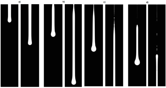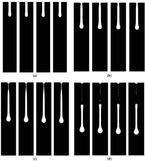- Zhang, X. Dynamics of drop formation in viscous flows. Chem. Eng. Sci. 1999, 54, 1759–1774. [Google Scholar] [CrossRef]