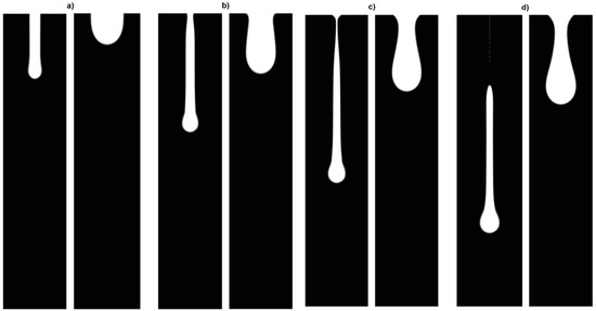 Similarly to the above studies, to investigate the influence of nozzle diameter in droplet generation and the breakup process, three different diameters were chosen. Figure 5 displays the comparison between two cases at four distinct time steps.