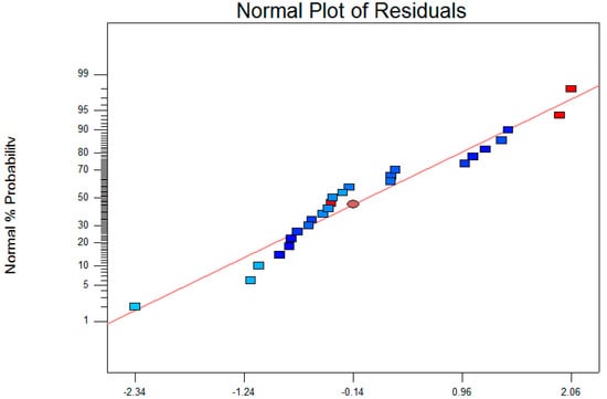 The last step to conclude on the model adequacy is to diagnose the residual for abnormalities. Basically, differences (residues) between experimental data and the computed model are analyzed to verify if the residuals are pure noise or if there are other reasons behind the residuals’ patterns. Figure 7 depicts the normal probability as a function of internal studentized residuals. As can be seen from Figure 7, residuals follow a normal distribution reasonably well, confirming that they are in fact pure noise.