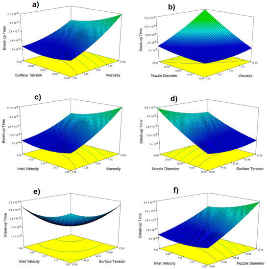 Contour response plots for break-up time as a function of (a) surface tension and viscosity, (b) nozzle diameter and viscosity, (c) inlet velocity and viscosity, (d) nozzle diameter and surface tension, (e) inlet velocity and surface tension, and (f) inlet velocity and nozzle diameter.
