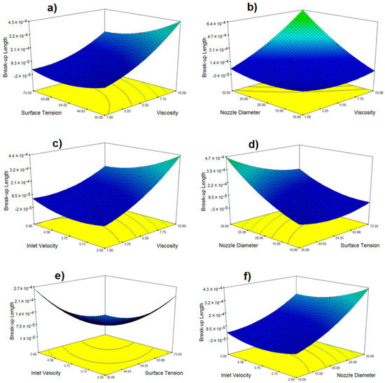 Contour response plots for break-up length as a function of (a) surface tension and viscosity, (b) nozzle diameter and viscosity, (c) inlet velocity and viscosity, (d) nozzle diameter and surface tension, (e) inlet velocity and surface tension, and (f) inlet velocity and nozzle diameter.