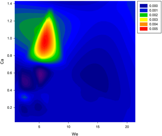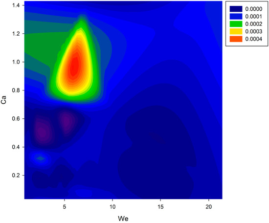 Many authors [11,12,13,14] use the Z number as the only index to evaluate the process jettability. However, the Z number presents a major limitation involving all the force terms that are important to droplet generation (inertial, viscous, and surface tension), meaning that several input factor combinations could lead to the same Z value. To overcome such a limitation, Nallan et al. [11] suggested implementing a map of the We−Ca space within which a printability region can be traced. To better understand the usefulness of the We−Re space, Figure 10, Figure 11 and Figure 12 show the Z number, break-up time, and break-up length as a function of the We–Ca space, respectively (computed from the 25 runs of the face centred design).