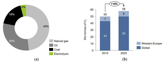 Hydrogen sources (a) and overall hydrogen production in Western Europe and worldwide (b) [1].