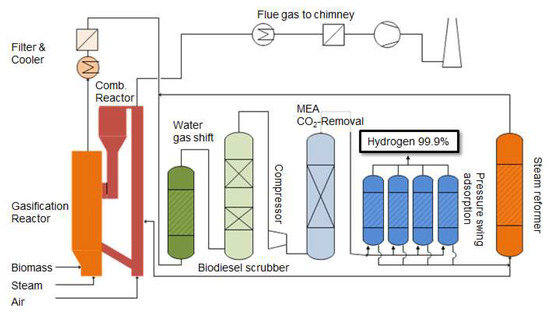 A dryer was used to adjust the water content of the wood chips, and enhance the gasification efficiency. After the dryer, biomass was fed into the gasification reactor where product gas is produced. This gas was mixed with recycle gas from the tail gas steam reformer and fed into a WGS unit to enhance the hydrogen yield using a CO conversion of 75%. After the WGS unit, the gas was cooled and impurities (e.g., BTXN, tars) were removed by biodiesel scrubbing. In the next step, a mixture of 30% MEA and 70% water was used to remove CO2, which is the most energy consuming step in this process. A separation efficiency of 98% could be achieved by operating at temperature levels below 100 °C. The CO2 lean gas stream was then compressed to 10 bar (ηis = 0.75) and processed in a PSA generating hydrogen and utility gas with a hydrogen recovery of 90% and a purity of 99.9%. A split stream was used in a steam reformer to enhance the hydrogen yield by steam reforming. This reformer was operated at 850 °C and an SV of 950 h−1. A platinum-based catalyst was used to catalyze the steam reforming reaction. Then, the tail gas of the steam reformer was fed back to the WGS unit. Surplus utility gas was used to fire a boiler, producing the heat energy for the process.