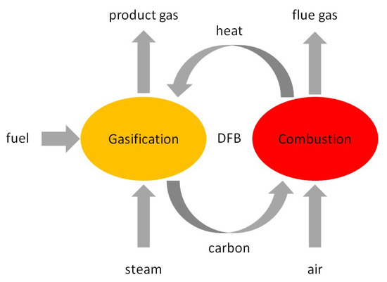 Dual fluidized bed steam gasification is an allothermal gasification technology, using steam as a gasification agent. Figure 4 shows the principle scheme of the DFB process. Two reaction zones coupled by a chute and a cyclone were applied for this process.