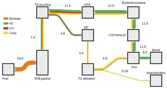 Sankey diagram of the energy balance for a 10 MW BioH2 plant only illustrating the LHV based energy streams in MW.