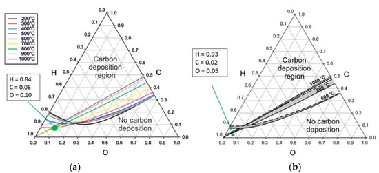 Figure 7 shows the C-H-O ternary diagrams illustrating the coke formation potential for WGS (a) and steam reforming (b).