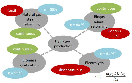 Comparison of different hydrogen production routes in respect to efficiency, hydrogen production and renewability.