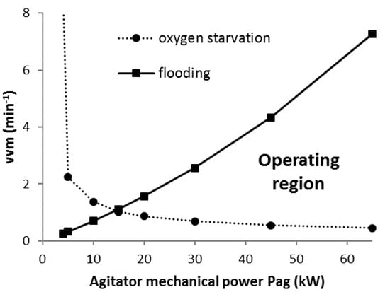 In this scenario both Pag and vvm are kept constant during each bioprocess run. There are constraints that place restrictions of feasible combinations of vvm and Pag values that allow the bioprocess to achieve completion. Impeller flooding places an upper limit on vvm for a given Pag, and Equations (13) to (15) were used to estimate the flooding vvm for each Pag. As vvm decreases, the oxygen concentration in the bioprocess liquid will also decrease, leading to longer bioprocess times. The microbes may suffer from “oxygen starvation” and die at low oxygen concentrations; a lower limit of oxygen concentration was thus applied as a constraint in the model. This was given a low value of 0.01 mg·L−1. This constraint on oxygen concentration places a lower value constraint on vvm for a given Pag. The flooding and oxygen starvation constraints are presented in Figure 2. The region between the flooding curve and the oxygen starvation curve represents feasible combinations of vvm and Pag that will allow the bioprocess to achieve completion. From Figure 2, the minimum feasible Pag is around 15 kW.