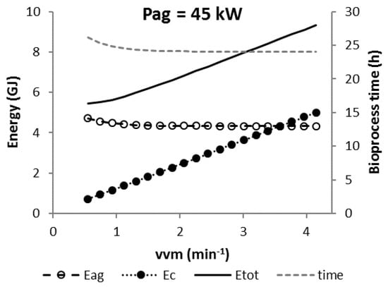 Scenario K: Influence of vvm on agitator (Eag), compressor (Ec) and total (Etot) electric energies and bioprocess time for Pag = 45 kW.