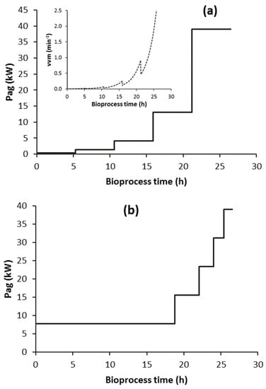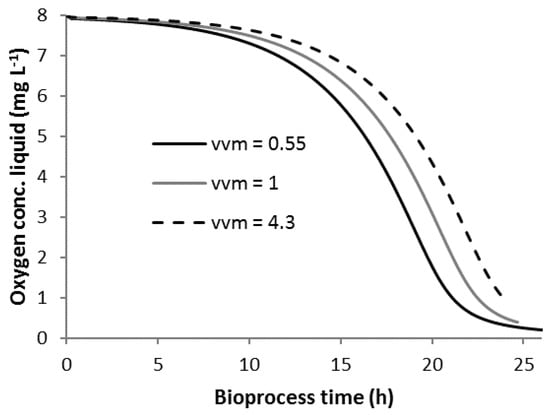 The parameter vvm is used in the modelling scenarios because in the bioprocess industry the air flowrate is commonly expressed in terms of vvm [], which is the volume of air per volume of liquid per minute and may be defined by Equation (12).