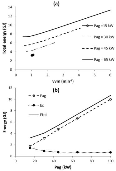 Figure 5a shows how Pag and vvm influence the total electric energy requirement. Results are provided for four constant values of Pag ranging from 15 to 65 kW. It shows that there are large variations in total energy requirement depending on the values of Pag and vvm selected and thus there is potential for major energy savings if appropriate values were chosen. Figure 5a shows that lower total energy is required as Pag is reduced towards 15 kW. However, the vvm operating window is also greatly reduced due to the constraints illustrated in Figure 2.