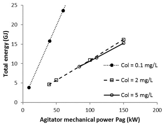 For each constant value of COL, the agitator, compressor and total energies were evaluated for agitator power values at and above the critical Pag value. Figure 6 presents total energy data as a function of constant Pag for three different values of COL. It shows that the constant value of Pag chosen has a major impact on total energy requirement and thus care needs to be taken in choosing this value. For a fixed COL, the minimum total energy occurs at the critical Pag, which is the value of Pag where flooding will start to occur at the time when OUR is a maximum. This is referred to as C1min. Considering this, it may be more prudent to operate at Pag values above the critical Pag due to uncertainties associated with flooding correlations.