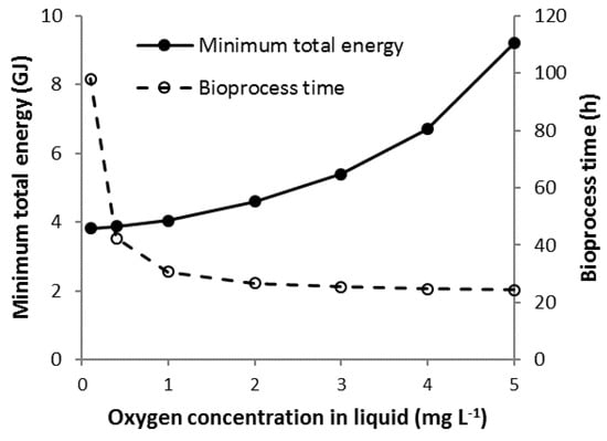 Figure 6 also shows that the critical Pag decreases as COL decreases. Less vvm is required at lower COL values because the maximum OUR is less and the mass transfer driver is greater, meaning the critical Pag is lower. Figure 7 presents the minimum total energy at discrete values of COL between 0.1 and 5 mg·L−1. The lowest minimum total energy was about 3.8 GJ, which occurred at 0.1 mg·L−1 and after a greatly increased bioprocess time of 98 hours. Thus, there is a trade-off between lower minimum total energy values and higher bioprocess times as COL is reduced.