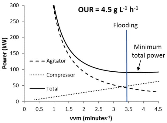 In this scenario COL is maintained constant by varying both vvm and Pag throughout the bioprocess. At a specific time during the bioprocess, many different combinations of vvm and Pag can be evaluated to provide an OTR that satisfies the OUR at that time in order to maintain COL at a constant value [,]. However, the values of vvm and Pag are subject to the constraints of phase equilibrium and agitator flooding outlined in Section 2.3. A typical evolution of OUR over the bioprocess time is given in Figure 1a. For a constant COL of 2 mg·L−1, the OUR varies from around 0 up to 4.55 g·L−1·h−1. Simulations were performed to evaluate the effect of vvm on the power requirement of the compressor and agitator that could supply the OTR required to satisfy the OUR in the range of 0 up to 4.55 g·L−1·h−1. Figure 8 presents data for an OUR value of 4.5 g·L−1·h−1. As expected, compressor power increases as vvm increases and there is a corresponding decrease in agitator power to supply the OTR required to meet the OUR. However, compressor power increases linearly with vvm while agitator power decreases in an exponential fashion. The trade-off between compressor and agitator power results in a value of vvm that minimises total power. In the simulations for OUR values in the range of 0 up to 4.55 g·L−1·h−1, this minimum tended to be located at a value of vvm that was beyond the flooding value. Consequently, the minimum total power that also satisfies the constraints was located at the onset of flooding. Figure 8 also highlights that care needs to be taken in the selection of vvm, so as to remain within constraints, especially the flooding constraint, and to avoid excessive total power requirement at lower vvm, due to excessive agitator power. Consequently, major savings in aeration system energy requirement can be made by careful selection of vvm and agitator power input requirement throughout the bioprocess, and mathematical modelling can assist in this selection.