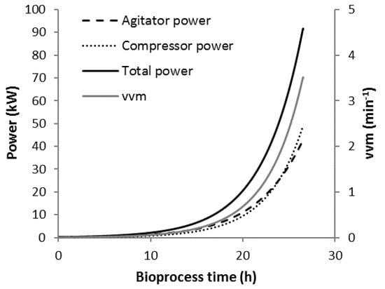 In the simulations the agitator mechanical power input requirement was either given a value or was estimated using the previous equations, including Equation (10). The compressor mechanical power requirement for a specific air flowrate was estimated from Equation (17) [].