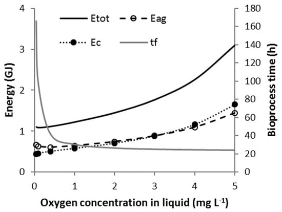 Scenario C1: Influence of oxygen concentration in the liquid on minimum total electric energy requirement.