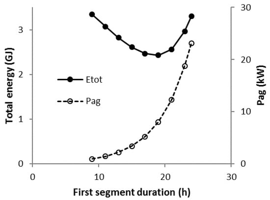 Energy requirements (MJ) for time segment configurations in C1-2 (the minimum energy requirement (C1-2min), the two time segment durations are the same (ΔtSEG = constant), and the two Pag step increases are the same (ΔPag = constant)).