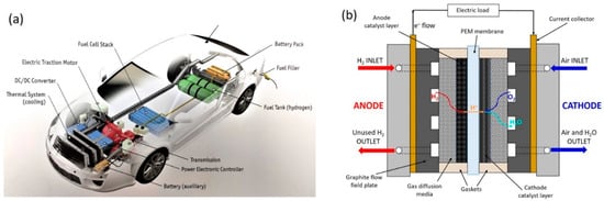 (a) Representation of a fuel cell vehicle (FCV) with details of the main components of the propulsion system; (b) schematic picture of a single Polymer Electrolyte Fuel Cell (PEFC).