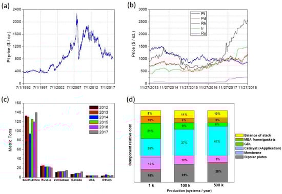 (a) Variation of the average monthly price (in US $/troy ounce) of Platinum from July 1992 to September 2018 []. (b) Variation of the average monthly price (in US $/troy ounce) of five Platinum Group Metals (PGMs) (Pt, Pd, Rh, Ir, Ru) in the last 5 years (November 2013–November 2018) []. (c) Major countries in global mine production of platinum from 2012 to 2017 []. (d) Breakdown of the 2017 projected PEFC automotive stack cost at a volume production of 1 k, 100 k, and 500 k systems per year [].