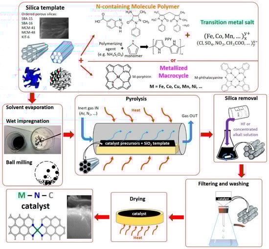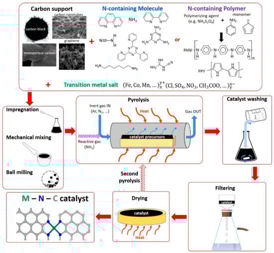 In this synthesis approach, the three key elements, C, N, and metal (M), necessary to produce the M–N–C catalyst, come from separate precursors. Figure 3 represents a scheme of a typical synthesis path that can be followed to obtain the catalyst.