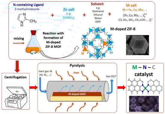 In this method, precursors containing additional sources of N and M are added to ZIF-8 or other Zn-based MOFs. This is an alternative method compared to the bimetal MOF approach, to incorporate Fe, Co, or Mn ions into the MOF-derived catalyst. In fact, since MOFs possess a highly porous structure, it is possible to absorb additional molecules inside their pores. Thus, in this case, we can imagine the MOF acting as the carbon support materials described in Methods 1 and 2. However, unlike carbon supports, which are inactive towards ORR, MOFs can be effectively used as a “host” ordered structured to incorporate the active metal ions into atomically dispersed M–Nx sites after the heat treatment, as described in Method 4 []. A schematic representation of this synthesis method is illustrated in Figure 6.