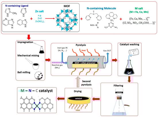 Scheme representing the typical steps for the synthesis of M–N–C catalysts with MOF and additional precursors (Method 5).