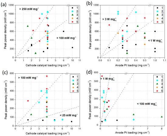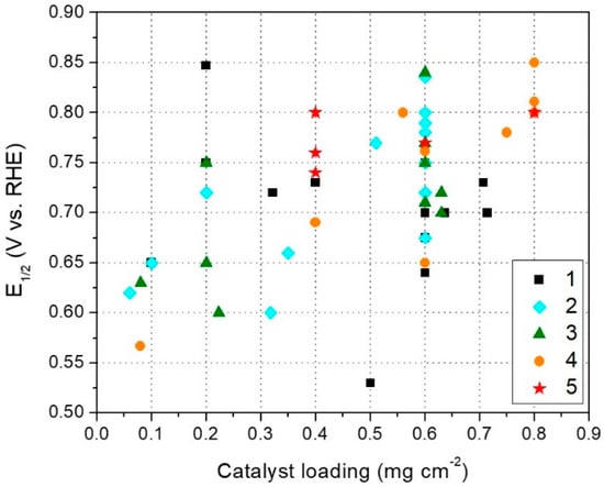 In this review, only H2-fueled acidic membrane PEFCs were considered, thus excluding direct alcohol (and other types of fuels) systems. The application in anion exchange membrane fuel cells (AEMFCs) was not considered in this review. Even though the use of M–N–C catalysts for ORR in alkaline medium has been reported extensively in the literature [,,,], only few works have been published showing the application of such catalysts in H2-fueled AEMFC with promising performance [,,]. In fact, AEMFC research is currently much focused on the membrane development (durability, conductivity, resistance to carbonation) [,] and on understanding the water management of the cell []. In these systems, the ORR catalyst activity should not represent the main problem, given the enhanced ORR kinetics in alkaline medium on several different types of PGM-free materials [,].