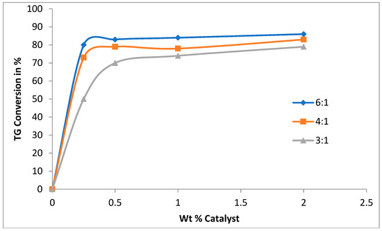 Effect of catalyst concentration on triglyceride conversion in a batch reactor. 0.5 wt % catalyst (CH3ONa), methanol:oil ratio (6:1, 4:1, 3:1), ultrasound amplitude 60%, temperature 35 °C, reaction time 1 min.