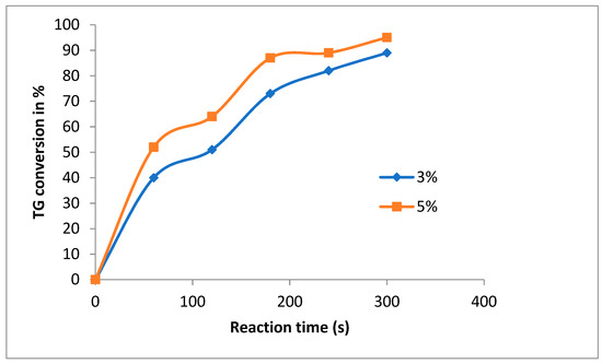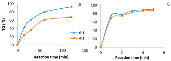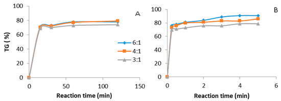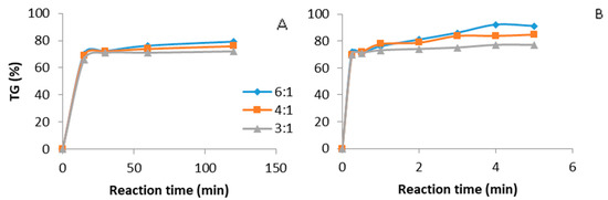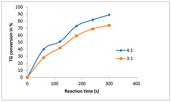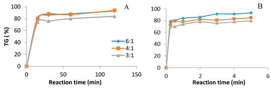 The molar ratio of alcohol to oil is one of the important factors that affect the TG conversion efficiency [31]. The comparison of ultrasound and mechanical stirring for molar ratio (6:1, 4:1, 3:1) shown in Figure 2, illustrates the relationship between TG conversion when exposing reactants to ultrasound (Figure 2B) or mechanical stirring (Figure 2A). The reaction conditions were 0.5 wt% catalyst (CH3ONa) at different molar ratios of methanol to oil and a temperature of 35 °C with US, but 65 °C in the stirred reactor. It can be seen that, in spite of the lower temperature, under ultrasonication the reaction time was much lower compared with the conventional method of using mechanical stirring.