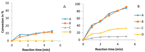 Figure 8 shows the TG conversion evolution under ultrasound (Figure 8B) and mechanical stirring (Figure 8A). In the presence of ultrasound, guanidine (A) and guanidine (B) transesterification reaction rates were similarly high. Guanidine (C) and guanidine (D) showed lower activity with only a small triglyceride conversion observed. In the case of mechanical stirring, reaction guanidine (A) and guanidine (B) yielded low conversions over the same length of time (five minutes) and guanidine (C) and guanidine (D) showed no reaction.