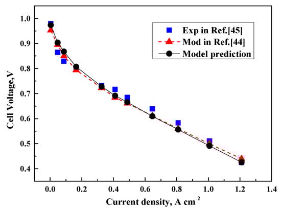 Polarization curves of present prediction compared with model prediction [] and experimental data [].