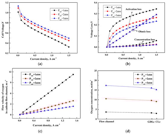 Cell performance under various operating pressures. (a) Cell voltage (V); (b) Voltage loss (V); (c) Flow velocity of oxygen in the cathode flow channel (m s−1); (d) Oxygen concentration (mol/m3).