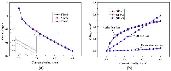 Polarization curves and ohmic resistance at different current densities under various oxygen stoichiometries are shown in Figure 4. Slight oxygen stoichiometry ratio has a slight influence on cell performance, as shown in Figure 4a. This finding is due to the process simplification adopted in the present model. In general, the cell potential improves with the increase of oxygen stoichiometry due to the augmented oxygen concentration in the CL reaction sites.