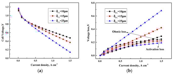 Cell performance of various CL thickness. (a) Cell voltage(V); (b) Voltage loss(V).