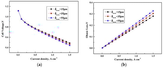 Cell performance under various membrane thickness. (a) Cell voltage (V); (b) Ohmic loss (V).