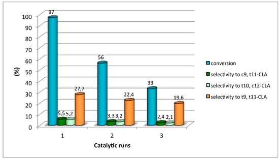 | Catalysts | Conversion (%) | Selectivity to c9, t11-CLA (%) | Selectivity to t10, c12-CLA (%) | Selectivity to t9, t11-CLA (%) | Other Products (%) |