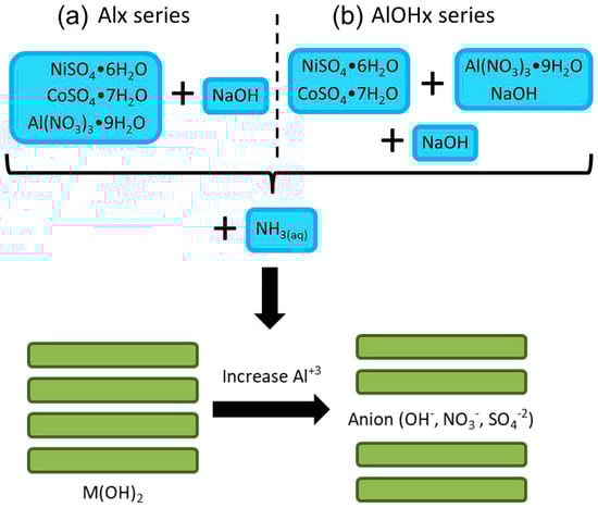 [Ni0.80Co0.15](1−x)/0.95Alx(OH)2 (x = 0–0.2, denoted as 0–20% Al) materials were synthesized by the coprecipitation method. Aqueous solutions of Ni(SO4), Co(SO4) and Al(NO3)3 were prepared with the Ni:Co:Al molar ratios specified in Table 1. In the first method (denoted as the Alx series, Figure 1a), the nickel, cobalt and aluminum reagents were dissolved into one solution (50 mL, 0.8M) along with a NaOH solution (50 mL, 2.2 M). For the second method (denoted as the AlOHx series, Figure 1b), the nickel and cobalt reagents were combined into one solution (50 mL, 0.76–0.64 M as the Al content increased) while the aluminum reagent was dissolved into a separate solution (50 mL, 0.04–0.16 M as the Al content increased) along with NaOH at an Al:OH molar ratio of 5 [17,26,36,38,40]. Similar to the first method, a NaOH solution (50 mL, 2.0–1.4 M as the Al content increased) was prepared but the concentration was adjusted to account for the NaOH in the Al solution (Table 1).