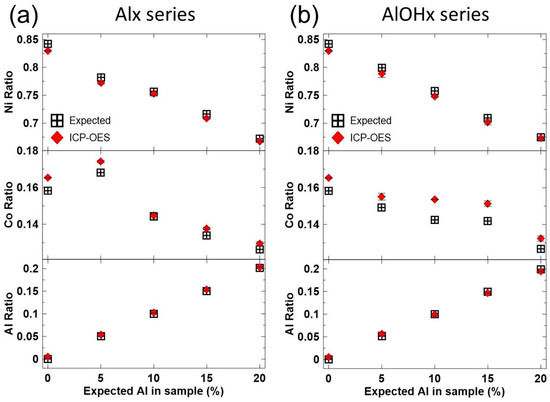 Metal atomic ratios were determined by ICP-OES and normalized to 1 for (a) the Alx series and (b) the AlOHx series.