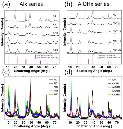 XRD patterns (Cu Kα radiation) of (a) the Alx series and (b) the AlOHx series samples collected from 6°–76° along with the patterns of β-Ni(OH)2 and α-Ni(OH)2·0.75H2O phases. The overlaid XRD patterns of (c) the Alx series and (d) the AlOHx series are shown below.