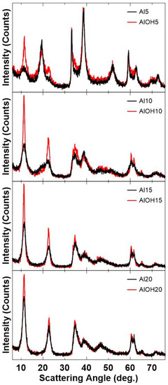 Figure 5 shows the comparison of the XRD patterns of the two series of samples by Al content. The AlOHx samples consistently exhibit larger, sharper peaks for the LDH phase than the Alx sample of the same Al content. This is most likely due to the AlOHx samples having larger grain sizes than the Alx samples. Smaller grain sizes from the Alx synthesis procedure can contribute to peak broadening as described by the Scherrer equation [44].