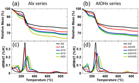 Figure 6 shows the normalized TGA results for the Alx series and the AlOHx series. The top panels (Figure 6a,b) show the relative mass loss as a function of temperature, while the bottom panels (Figure 6c,d) show the rate of change of relative mass with temperature plotted as a function of temperature (dRM/dT vs. T). The TGA results were normalized for ease of comparison of both the mass loss and the rate of mass loss.