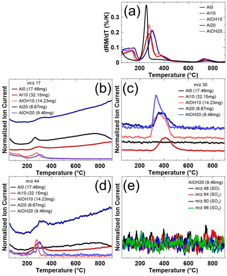 Figure 7 shows the TGA-MS results for the 0%, 10% and 20% Al samples. Figure 7a shows dRM/dT vs. T while Figure 7b–d shows the MS data for m/z ratios of 17 (Figure 7b), 30 (Figure 7c) and 44 (Figure 7d) which correspond to the species OH (from OH−), NO (from NO3−) and CO2 (from CO32−), respectively (the expected LDH anions are in brackets). Figure 7e shows the AlOH20 MS data for the m/z ratios of 48 (SO), 64 (SO2), 80 (SO3) and 96 (SO4). The MS ion current data in Figure 7b–e has been divided by the mass of the sample in each experiment so that the relative peak heights can be more easily compared. However, for completeness, the mass of each sample is listed in the figure legends. While all samples were tested with an air flow rate of 100 mL/min, the background differences likely stemmed from some difference in the air composition or air intake and are not expected to impact the experiment. However, the different backgrounds complicate any background subtraction procedure so the raw MS data (divided by sample mass) is shown.
