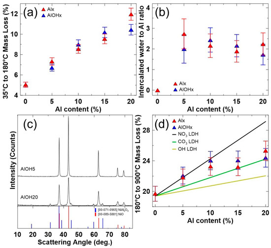Figure 8d shows that mass loss from both the Alx series and AlOHx series are comparable when considering samples of the same Al content. This confirms the scenario discussed in Figure 5. Since the amount of LDH phase is similar, then the differences seen in Figure 5 stem from the Alx synthesis method producing particles with crystallite grains that are much smaller in size than the AlOHx method and broadening the peaks seen in the XRD patterns.